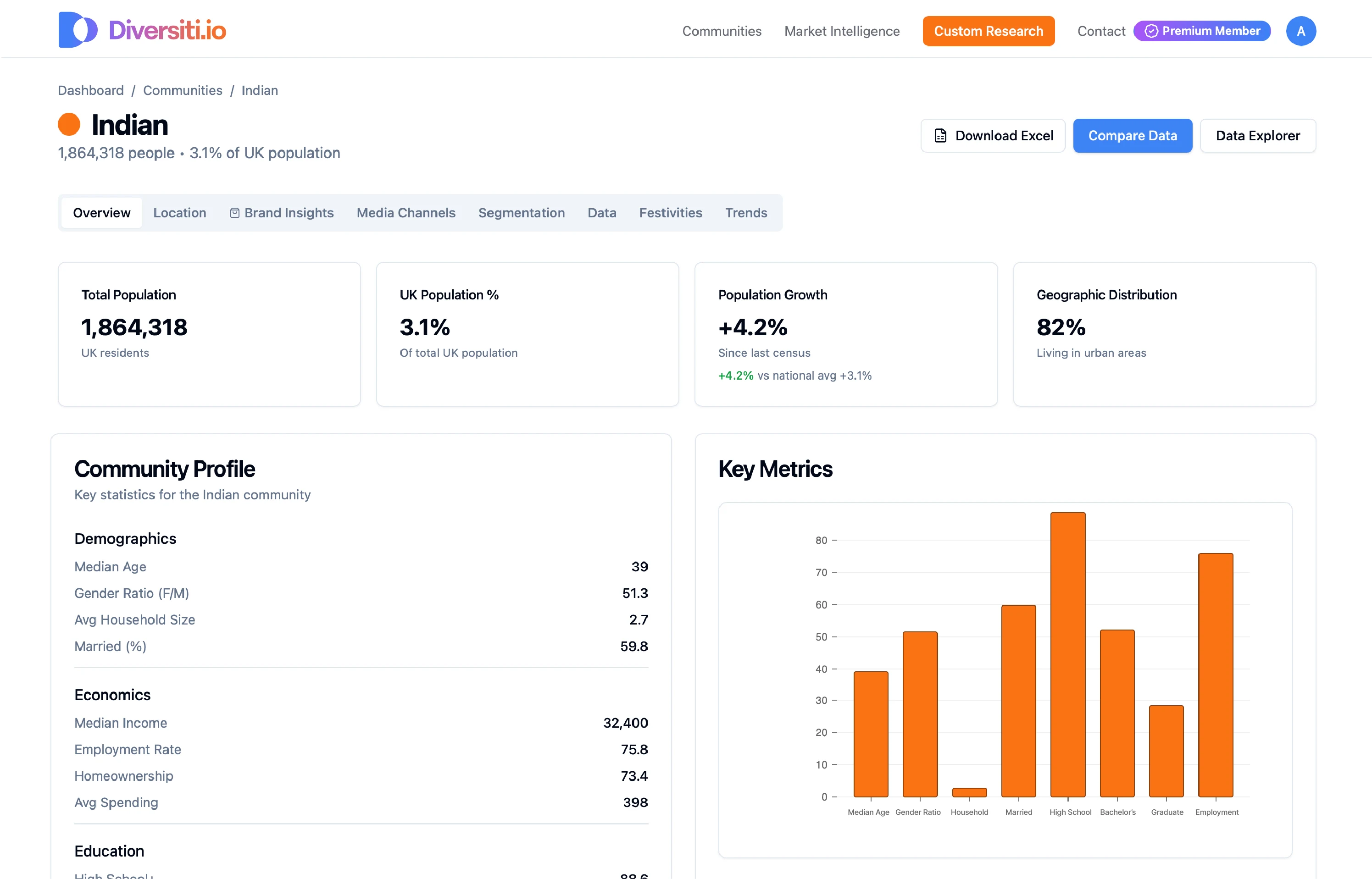 Diversiti.io maps the cultural, behavioural, and demographic layers of over 20+ ethnic communities in the UK. It helps brands identify who their audiences are, how they think, what they value, and how they behave across cultures-delivering the insights needed to create truly resonant campaigns.